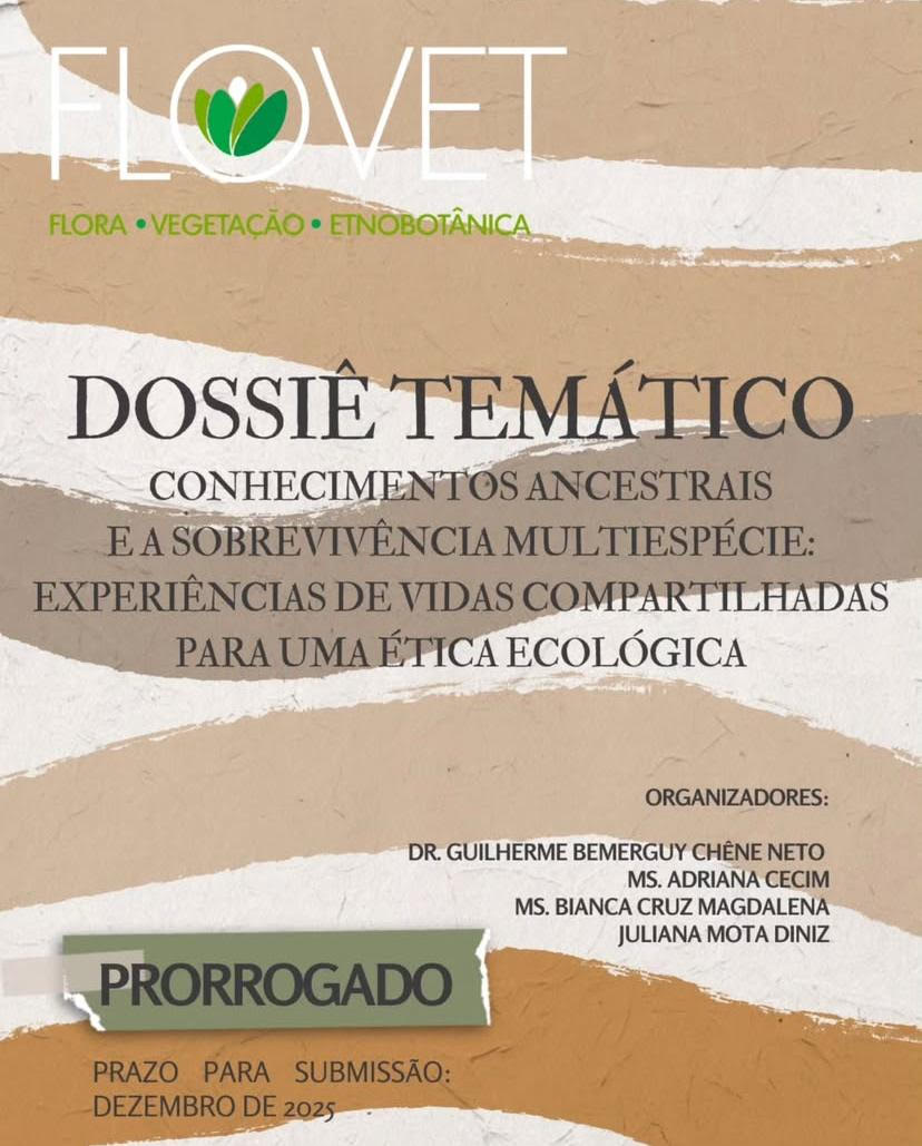 A revista FLOVET - Flora, Vegetação e Etnobotânica - vinculada formalmente ao Departamento de Botânica e Ecologia do Instituto de Biociências da Universidade Federal de Mato Grosso (IB/UFMT) divulga a prorrogação da chamada de artigos para o Dossiê Temático "Conhecimentos ancestrais e a sobrevivência multiespécie: experiências de vidas compartilhadas para uma ética ecológica". Prazo para submissões: 31 de dezembro de 2025. Informações: Chamada.