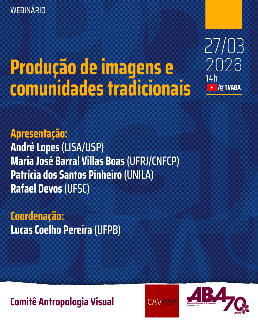 Este webinário objetiva mostrar como questões relacionadas à racialidade, lutas por terra e território, memória, relações entre ambientes, humanos e outros mais que humanos ganham forma em narrativas visuais produzidas junto a povos e comunidades tradicionais. Longe de apresentar uma simples catalogação ou inventário de práticas, a produção contemporânea de imagens junto a esses coletivos tem enfatizado as múltiplas potencialidades e efeitos das imagens, sejam elas fotográficas, audiovisuais ou outras. Interessa-nos refletir de que forma os caminhos narrativos e estéticos trilhados em diferentes contextos de pesquisa apontam para dilemas e escolhas singulares junto às especificidades de comunidades quilombolas, indígenas, ribeirinhas, pesqueiras, geraizeiras, etc. Em última instância, o que - através de teorias elaboradas visualmente - a produção antropológica tem apontado sobre as dinâmicas socioculturais, políticas e ecológicas de povos e comunidades tradicionais hoje? .